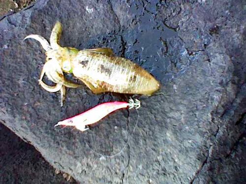 小さい烏賊たちが5ハイ釣れました。こんな感じです。 推定700gかと思われる烏賊が追っかけてきましたが、抱かせるまでにはいきませんでした。 残念。 ガラカブを釣ってみようかなと思い場所移動します。 ちびっ子だけ2匹でした。小雨日和の中、なかなか厳…