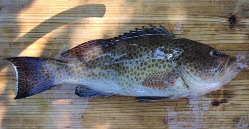 今日は思ったより風が強い1日でした。 でも長島の天草側で風の影響が少ない所があったのでカヤック出航してきました。 いつものようにタイラバで勝負です。 開始早々、ハタを思わせるヒット! 上がってきたのはオオモンハタ38cmでした。 今日は期待が膨らみ…